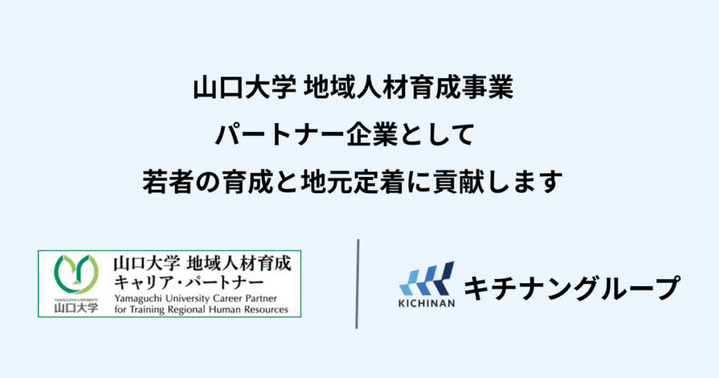 このたび、キチナングループは山口大学の「地域人材育成事業 キャリアパートナー」として参画が決定しました。この制度は、大学と地域企業が連携し、学生のキャリア形成支援や、地域に根ざした実践的な教育を通じて、山口の未来をリードする若者の育成と地元への定着を推進することを目的としています。