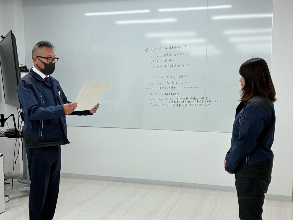 昨年末の納会(12月29日)では、受賞した柳田さんへ、常務取締役の平井より表彰状の授与が行われました。