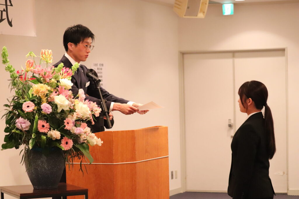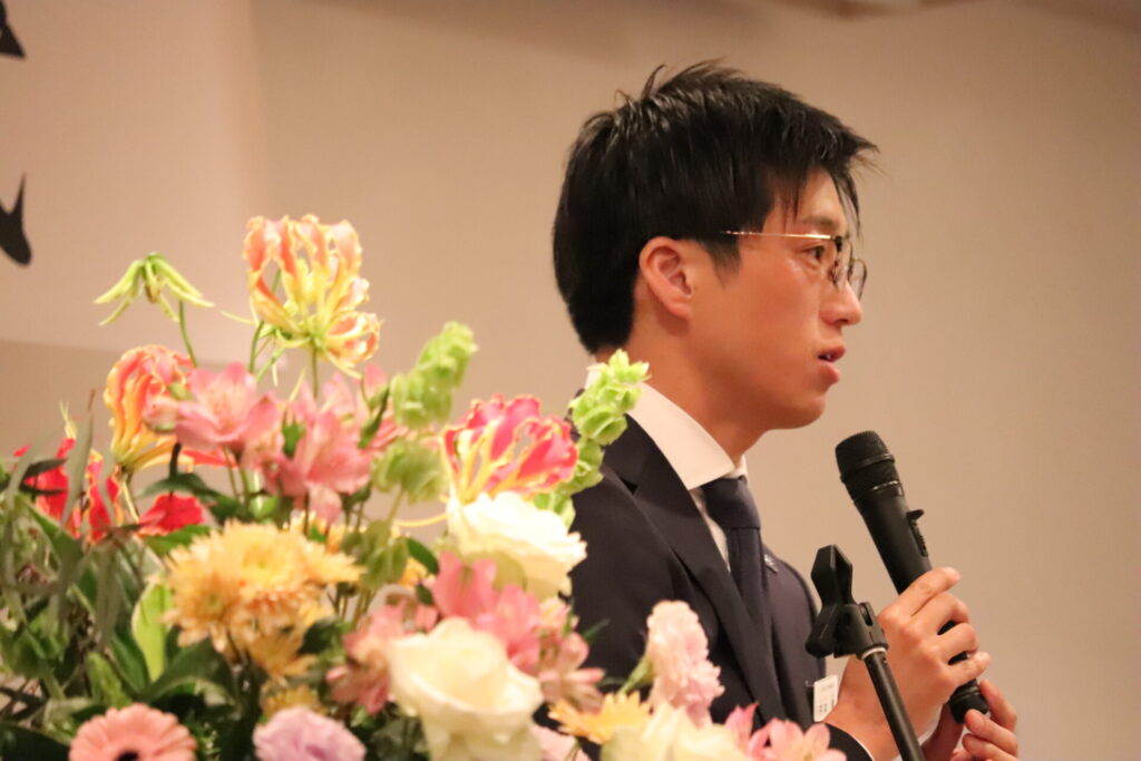 祝辞では、代表の井本より「仕事を好きになるために①3年間はしっかり向き合う②信頼できる師匠や上司を見つける③同期を大切にしよう」という言葉が贈られました。