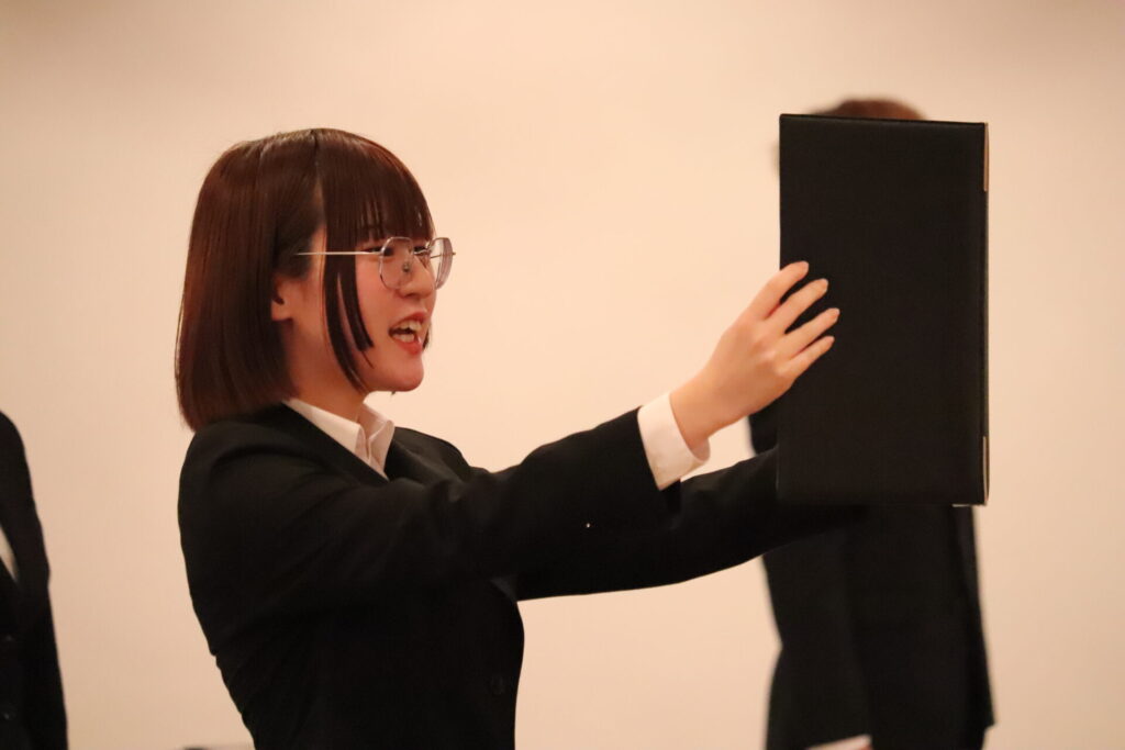 堂々と明るく元気に決意を述べており、決意新たに社会人生活に臨んでいきたいという姿勢が伝わりました。